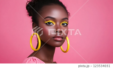 Bright makeup and bold accessories enhancing beauty of young woman in pink