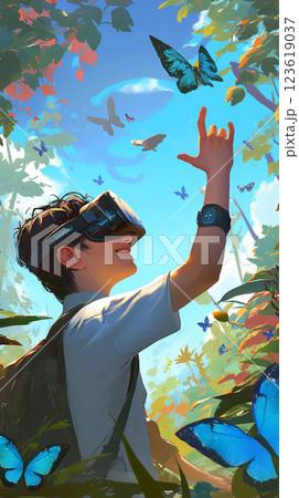 一個男孩透過 VR 眼鏡觀察另一個世界