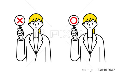 持有 〇 和 × 標記的標籤的女性