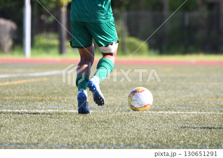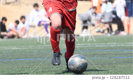 Young man juggling soccer ball on grass field in daylight, wearing red uniform and orange vest