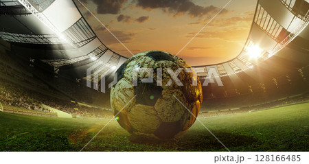 Dirty soccer ball on 3D grass field with stadium lights and sunset in background