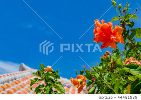 夏日沖繩藍天、紅瓦和鮮紅芙蓉