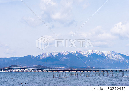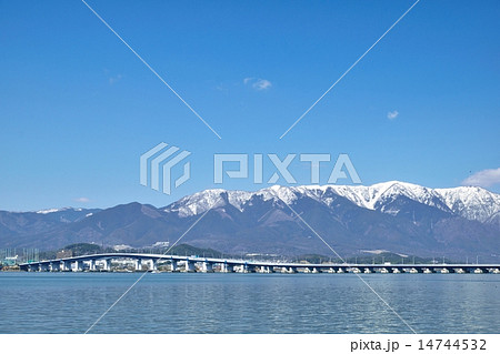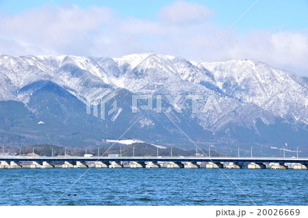 穿過琵琶湖的琵琶湖Ohashi橋樑在早期的春天和雪Higarashi山作為背景