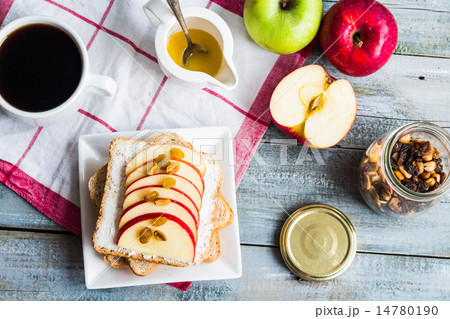 toast with cheese curd, honey and apple,