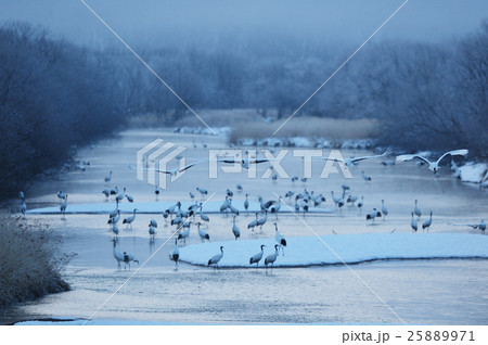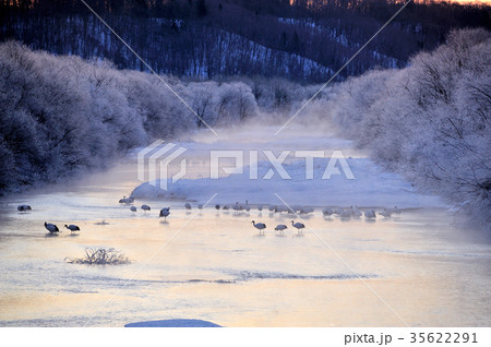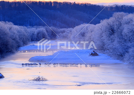 黎明時分,白雪覆蓋的河流,霧和山脊起重機“阿寒郡鶴井村”
