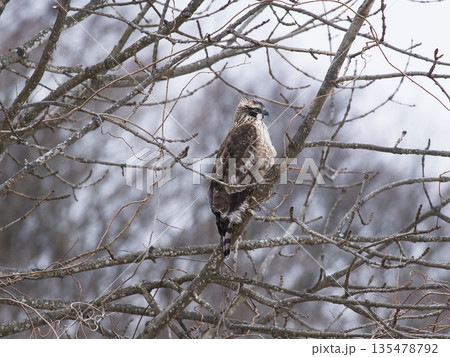 山鷹棲息在森林的樹枝上。