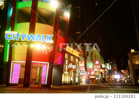 日本環球影城 (USJ) 周圍的夜景無人機航拍圖像