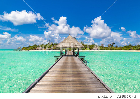 tropical sunset seascape. overwater bungalow with jetty