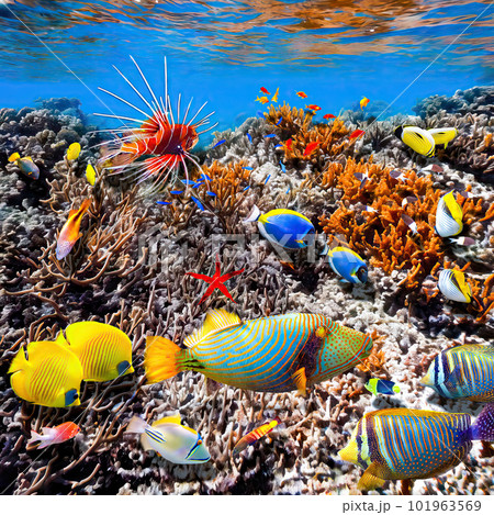 Wonderful and beautiful underwater world with corals and tropical fish
