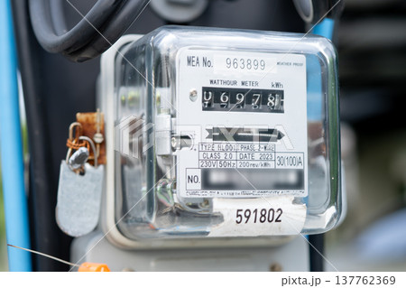 Bangkok, Thailand - May 15, 2022 Electric measuring power meter for energy cost at home and office.