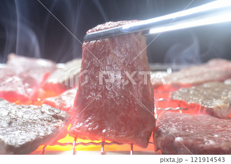 燒烤烹飪場景。牛舌,牛肉。