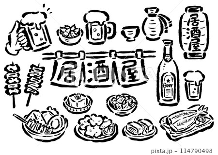居酒屋門簾、燈籠、酒類與點心、毛筆手繪插畫、線條畫套裝