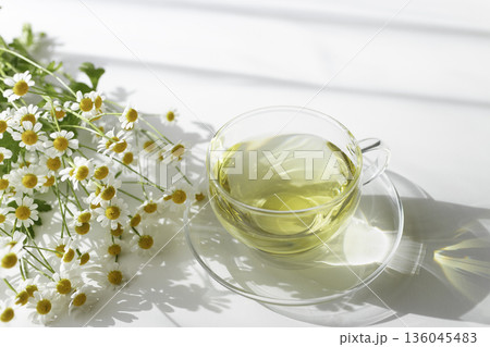 陽光下,白色背景上的洋甘菊茶和洋甘菊花。光影交錯。留白。
