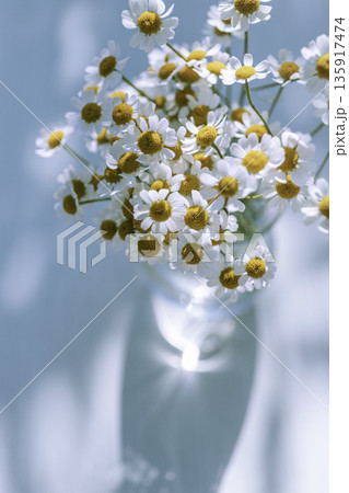 一束母菊花,柔和的虛化效果和留白,淺藍色背景(豎圖)