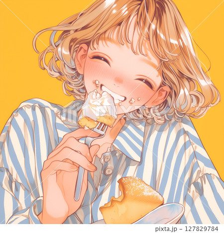 少女捧著美味蛋糕,露出笑容。充滿溫柔色彩和甜蜜的甜點藝術。