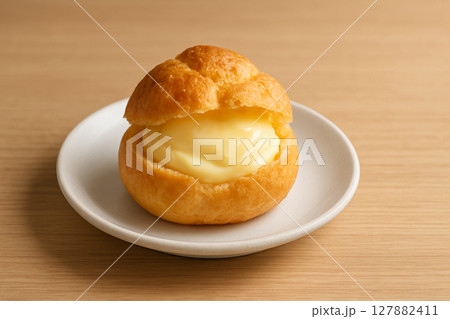 一份簡單的奶油泡芙,盛放在白色盤子裡