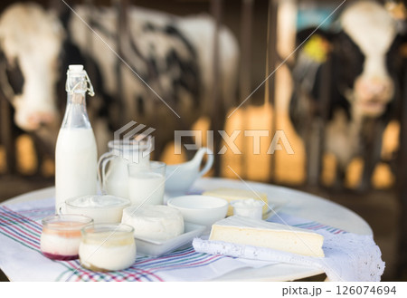 Dairy products on table against the background of herd of cows in barn