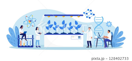 Chemists study cells, plant structure. Biochemical laboratory staff performing various experiments