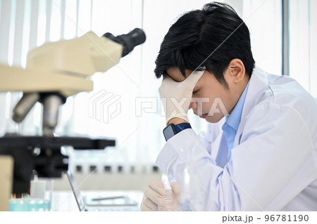 Serious Asian male scientist or chemist upset and worried on his medical experiment project