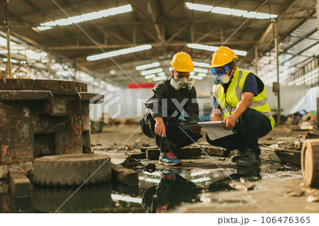 Chemical toxic liquid oil gas leak danger to environment impacts investigation team working site rescue and examination with safety