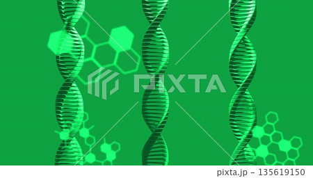 Displaying three green DNA double helix structures across biotech backdrop, with hexagonal motifs