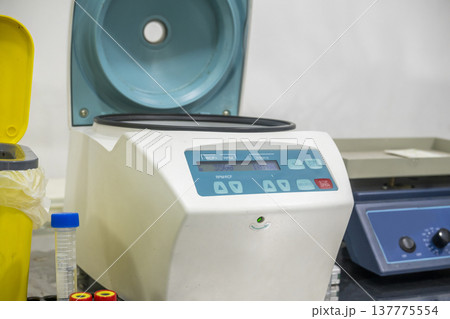 A high-quality image of a medical centrifuge machine in a laboratory setting, used for separating blood samples and other liquids for diagnostic analysis