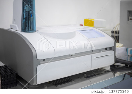 Professional automated biochemical analyzer in a modern clinical laboratory setting. High-tech medical equipment for precise diagnostic testing and blood analysis