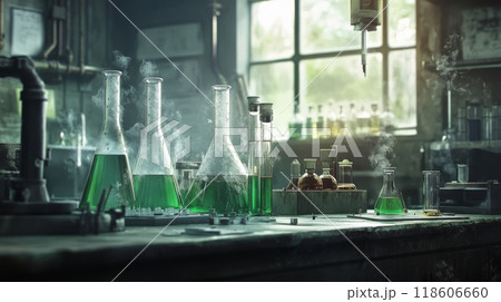 Green potion bubbling in a clear glass flask, sealed with a cork stopper on a black background