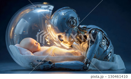 Futuristic humanoid robot looks after newborn baby in transparent cradle, emotional connection between technology and life