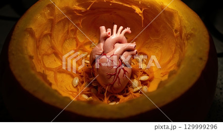 An anatomical heart model with intricate veins rests centrally inside a hollowed-out pumpkin, surrounded by fibrous strands and numerous seeds under warm, focused lighting.