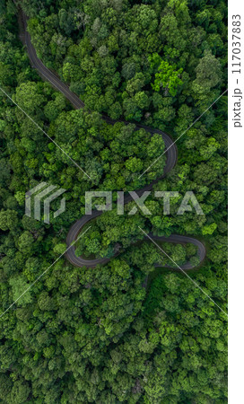 Aerial view of mountain road in forest in summer season, Top view from drone of curve road, Landscape with curved roadway, Beautiful trees Travel asia Phuket Thailand