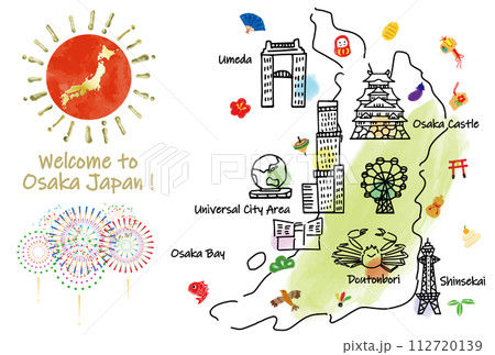 可愛的大阪旅遊目的地插畫地圖手繪線圖