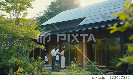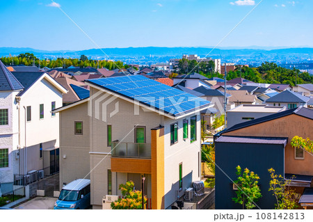 裝有太陽能板的房屋和設有電動車充電站的街景(3D)
