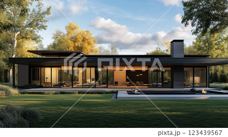 一棟豪華的住宅。兩層樓房屋的外觀,木材和石材和諧地融合在一起