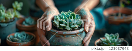 A person holding a succulent plant in a pot, surrounded by other plants in a cozy setting.