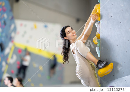 Motivated young girl climbing without ropes and harnesses on artificial bouldering wall in fitness center