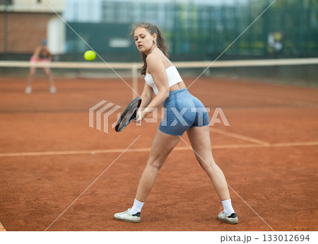 Portrait of young guy playing tennis on open court in summer, swinging racket to return ball over net. Sportsman ready to hit volley