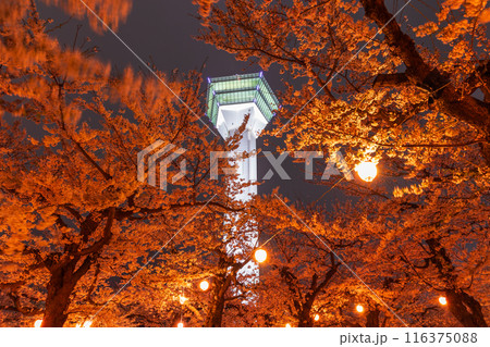 北海道函館市的春天,五稜郭公園盛開,夜晚的櫻花燈火通明