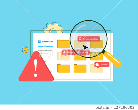 Data surveillance practices reveal hidden metadata like cookies, logs, tracking details and behavioral patterns masked under normal folder structure for digital privacy awareness vector illustration