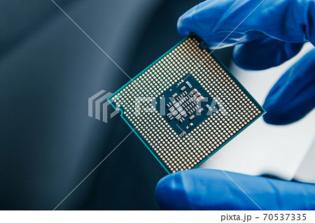 Close-up view on a new semiconductor microchip in gloved hand of computer scientist. Modern technology and hardware development