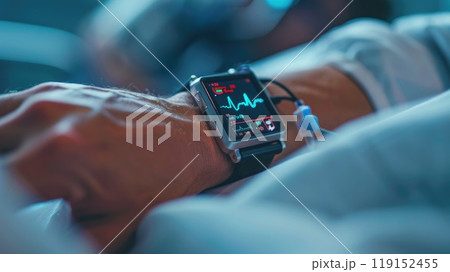 Monitoring vital signs, Close-up of wearable health tech device on patient's wrist