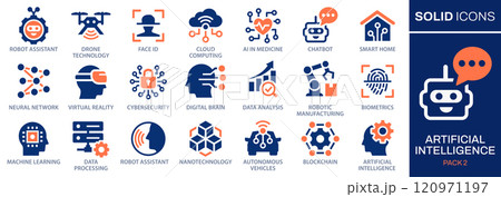 Artificial intelligence icons, such as innovation, machine learning, robotics and more. Vector illustration. Easily changes to any color.
