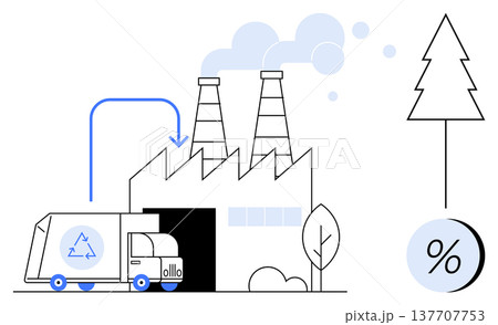 Waste management, eco-friendly practices, sustainability efforts, environmental conservation, industrial recycling, pollution reduction. Factory with smoke stacks, recycling truck, and tree icon