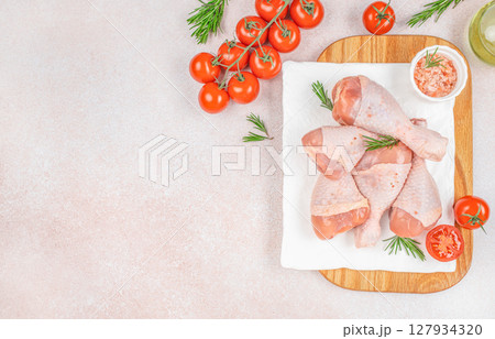 Raw chicken legs with salt, spices, herbs and tomatoes
