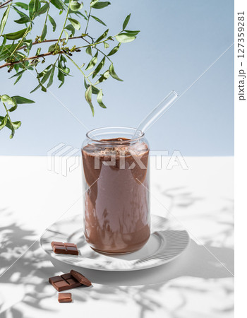 Chocolate smoothie with banana in a glass on a white blue background with morning shadow