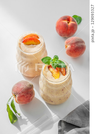 Two glasses of smoothie with peach and banana on a white background with tropical fruits