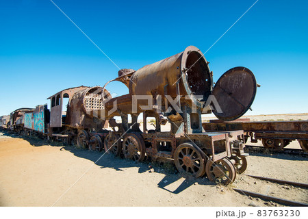 Rusty old steam train in Bolivian desert - train cemetery in Uyuni