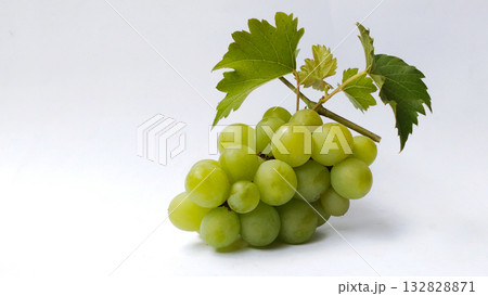 Fresh green grapes with leaves on white background
