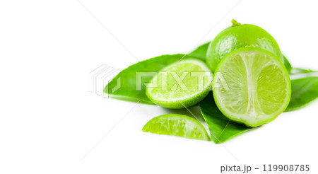 Limes and lime halves placed on a white background, highlighting the freshness and vibrant color of the fruit.