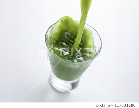 Healthy green smoothie with spinach, banana, and vegan milk in glass on light grey background, copy space
